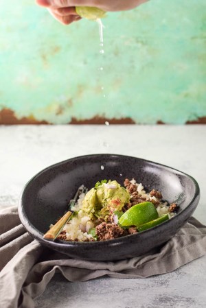 - Prepare the bowls: Top the cauliflower rice with ground beef, guacamole, fresh lime juice and any other of your favorite taco toppings!